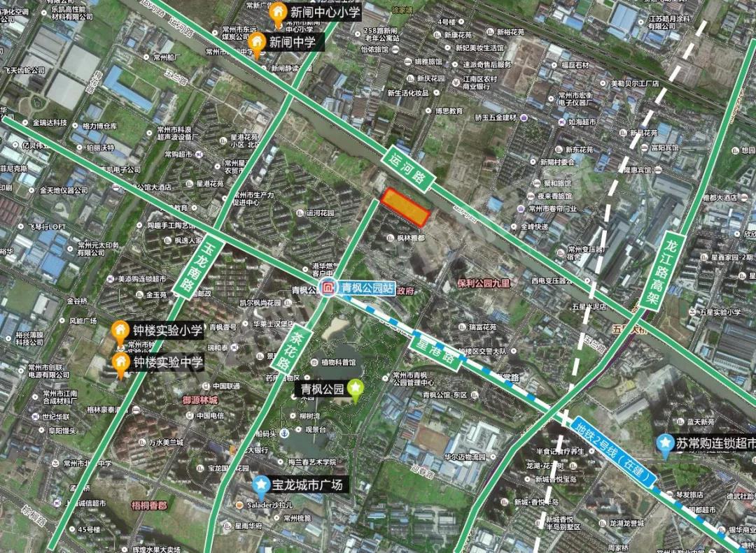 从区位配套来看,地块南侧有钟楼区政府、常州最大的免费的敞开式公园青枫公园、中信国际商务酒店,以及港龙华庭商业、宝龙城市广场等商业配套,生活配套较为完善。