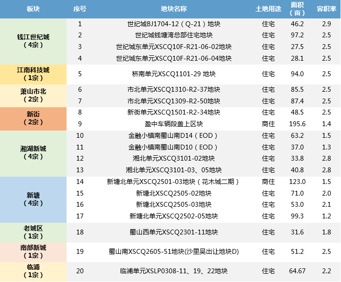 20宗地块总计出让面积1365亩,包括18宗宅地和2宗商住地,分布于钱江世纪城4宗,江南科技城1宗,萧山市北2宗,新街2宗,湘湖新城4宗,新塘4宗,老城区1宗,南部新城1宗,临浦1宗。