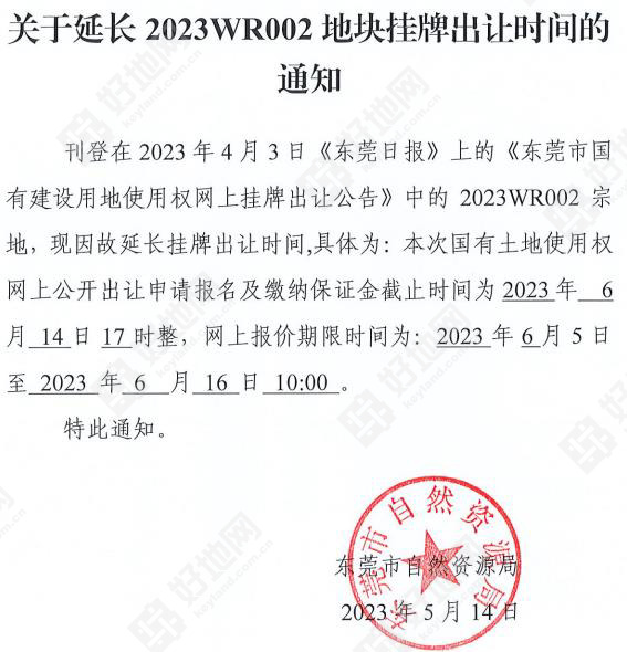 好地网5月14日消息(研究员 黄卓贤)今天,东莞市自然资源局发布通知,将原定于下周二(5月16日)出让(5月12日保证金截止)的常平镇还珠沥村2023WR002号地块延后1个月出让,具体延期后保证金截止时间及出让时间为: