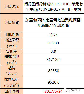 闵行区莘庄镇闵行新城MHPO-0201单元18A-01A-1B地块(原闵行新城MHC10204单元18A-01A-1B地块),东至:用地红线,南至:秀文路,西至:园秀路,北至:用地红线,用地性质为商办,出让面积15725.9㎡,容积率3.3,建筑面积51895.47㎡,起价33733万元,楼面起价6500元/㎡。