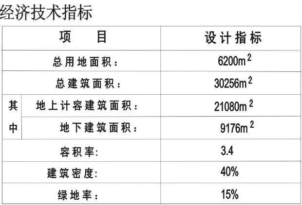 项目总用地面积6200㎡,总建筑面积30256㎡,容积率3.4,建筑密度40%,绿地率15%。