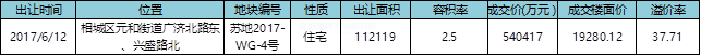 6月12日,经过长达近1个小时的竞拍,苏地2017-WG-4号地块以成交价54.04亿元被中建东孚获得,楼面价19280.12元/平米,溢价率为37.71%。