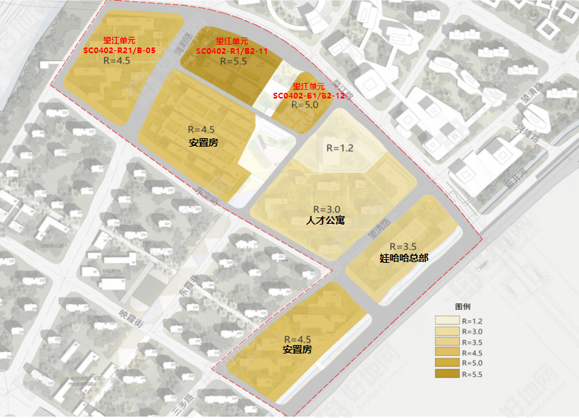 其中,望江单元SC0402-R21/B-05地块用地面积27215㎡,容积率≤4.5,建筑面积122467.5㎡,住宅和商业建筑面积比例为6:4;
