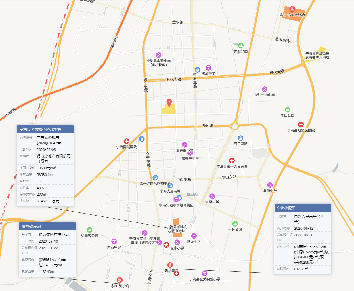 地块南面1.9公里处,去年9月3日,得力以上限价格61457.13万元竞得宁海县老城核心区01地块,楼面价10500元/㎡,溢价率40.0%,竞配保障性住房面积200㎡。