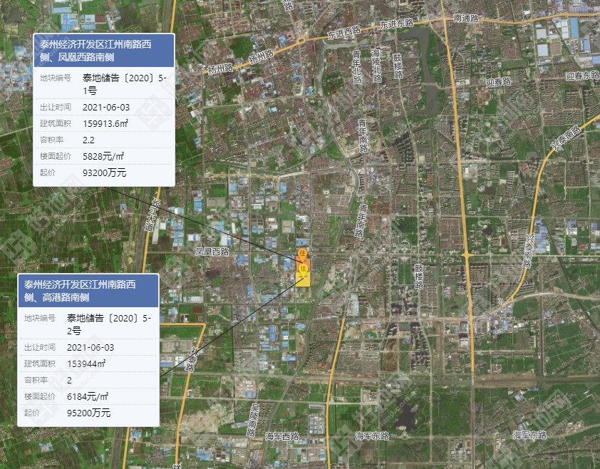 2宗地块位置相邻,距离泰州市政府直线距离2公里,紧邻凤凰西路、青年南路等交通主干道。周边有泰州中学附属初中、鲍徐小学、泰州中西医结合医院、人民医院等教育医疗配套。华钜活力城、万达广场可以满足日常消费需求。