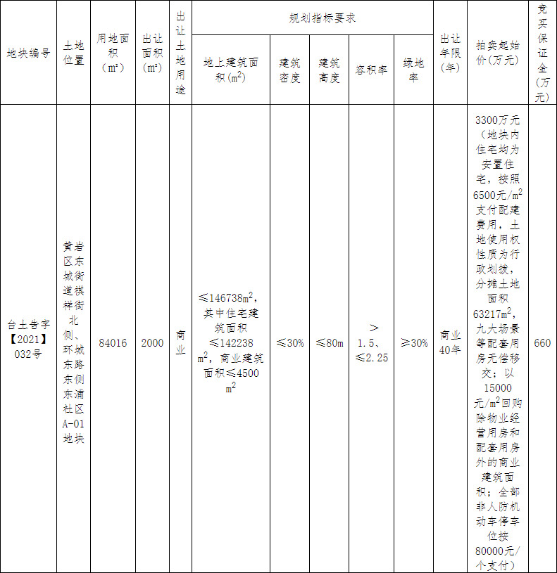 经台州市人民政府台供地[2021]20028号批准,台州市自然资源和规划局决定以拍卖方式出让一(幅)地块的国有建设用地使用权。现将有关事项公告如下: