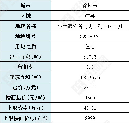 出让面积59026㎡,容积率2.6,建筑面积153467.6㎡。起价23021元/㎡,起始楼面价1500元/㎡,上限价格46021万元,上限楼面价2999元/㎡。