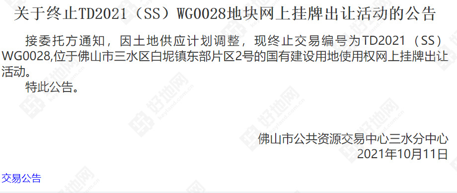 好地网10月11日消息(研究员 黄卓贤)今天,佛山市公共资源交易中心发布公告,原计划于10月13日出让的三水区白坭镇东部片区2号(保证金缴纳截止时间为10月11日)终止出让。