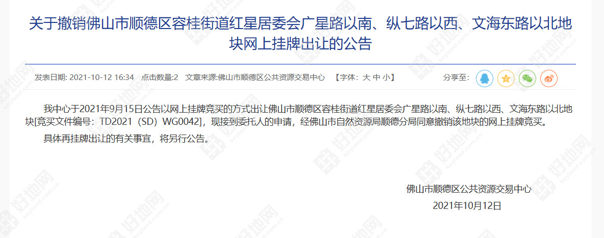 好地网10月12日消息(研究员 黄卓贤)今天,佛山市公共资源交易中心发布公告,原计划于10月15日出让的顺德区容桂街道红星居委会广星路以南、纵七路以西、文海东路以北TD2021(SD)WG0042地块(保证金缴纳截止时间为10月13日)终止出让。