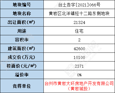 仅1轮报价,台州市黄岩大环房地产开发有限公司(黄岩城投)以底价10100万元竞得黄岩区北洋镇经十二路东侧地块,楼面价2371元/㎡。