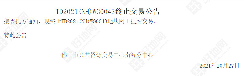 好地网10月28日消息(研究员 黄卓贤)昨天,佛山市公共资源交易中心发布公告,原定于本月29日出让的南海区丹灶镇大金智地金智一路北侧TD2021(NH)WG0043地块(保证金缴纳截止时间为10月27日)终止出让。