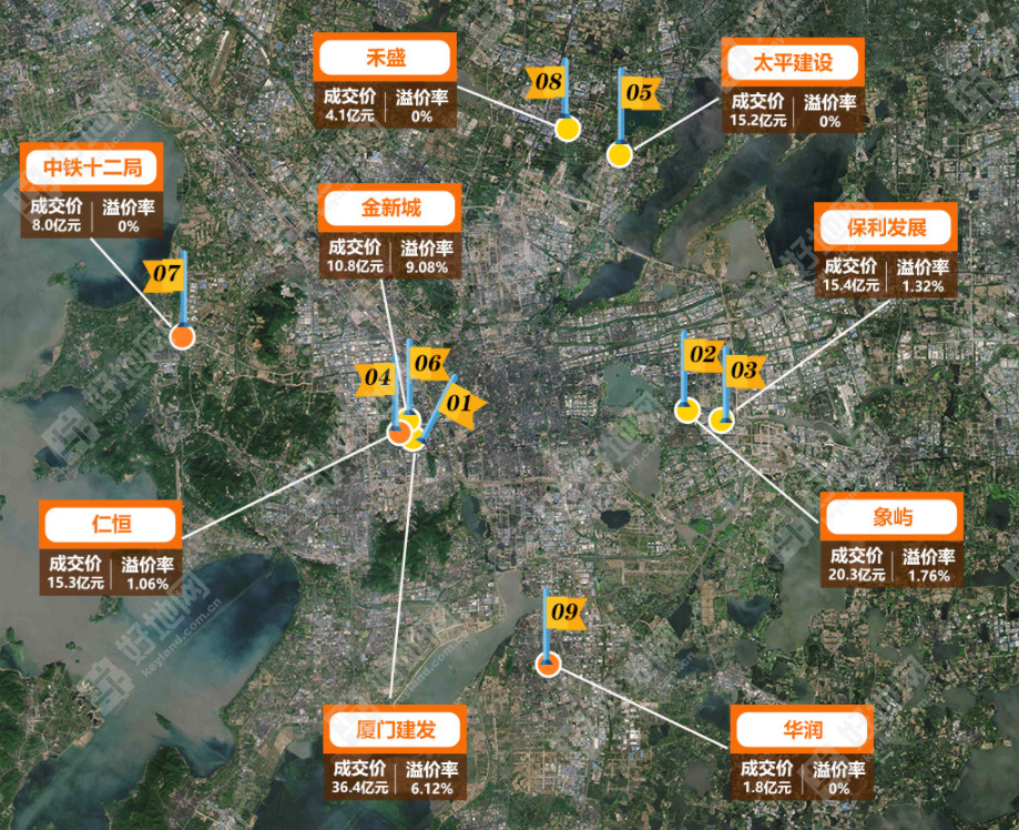 厦门建发以36.4亿位居榜首;保利发展以15.4亿位列第二;仁恒排名第三,拿地额15.3亿。