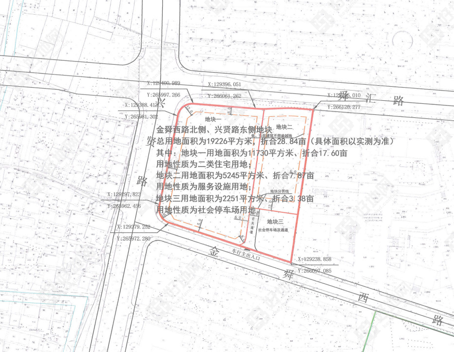 地块位于金舜西路北侧、兴贤路东侧,出让面积19226㎡(含幼儿园5245㎡和停车场2251㎡),总建筑面积20389㎡。