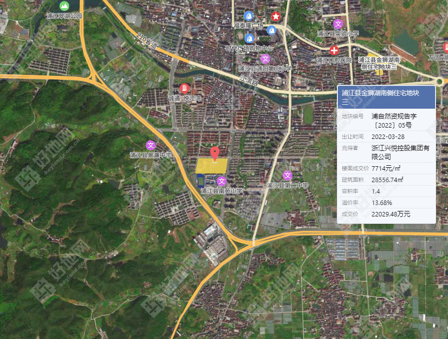 地块东北方向1.68公里处,今年3月28日,浙江兴悦控股集团有限公司以总价22029.48万元竞得金狮湖南侧住宅地块三,楼面价7714元/㎡,溢价率13.68%。