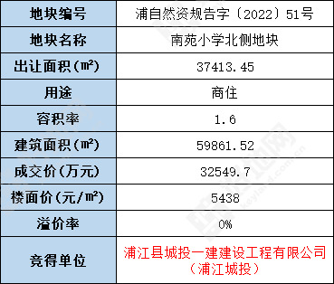 仅1轮报价,浦江县城投一建建设工程有限公司(浦江城投)以底价32549.7万元竞得浦江县南苑小学北侧地块,楼面价5438元/㎡。