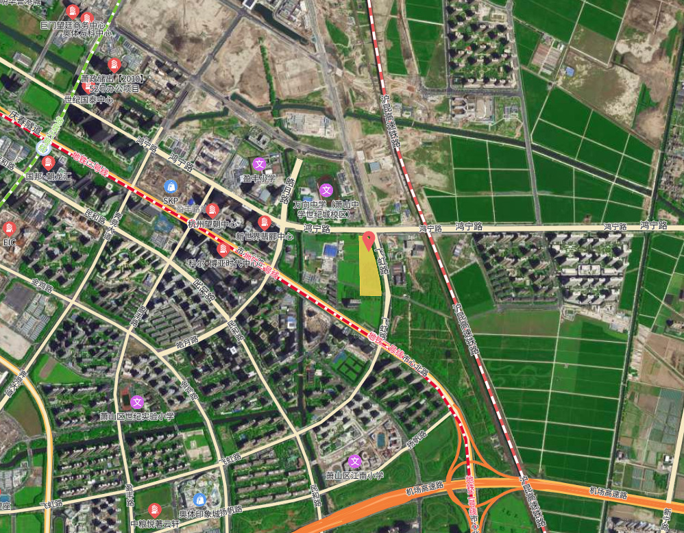 地块距杭州SKP约1.2公里,距地铁2号线飞虹路站不到400米,地铁一站可达SKP,周边配套包括盈丰小学、萧山中学世纪城校区、世纪实验小学、奥体印象城等。