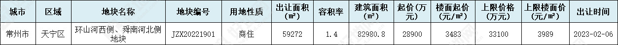 天宁区环山河西侧、舜南河北侧地块,出让面积59272㎡,容积率1.4,建筑面积82980.8㎡,将于2月6日出让。