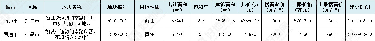 南通如皋市出让2宗,总出让面积12.69万方,总建筑面积31.72万方,总起价9.5亿,将于2月9日出让。