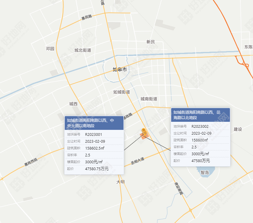 如城街道海阳南路以西、花海路以北R2023002地块,出让面积63440㎡,容积率2.5,建筑面积158600㎡。