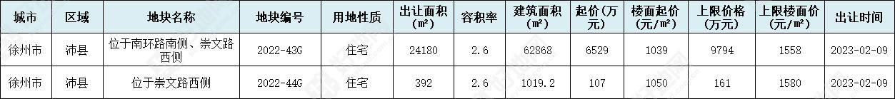 徐州沛县出让2宗,总出让面积2.46万方,总建筑面积6.39万方,总起价0.7亿,将于2月9日出让。