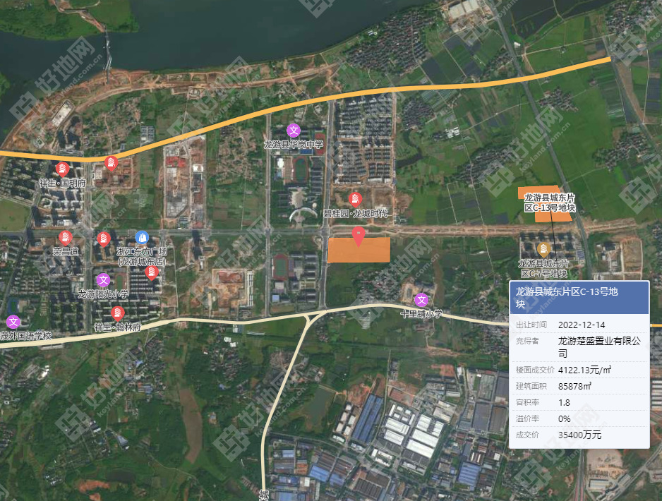 地块东侧约1公里处,去年12月14日,龙游楚盛置业有限公司以底价35400万元竞得龙游县城东片区C-13号地块,楼面价4122元/㎡。