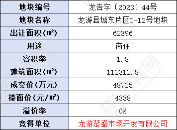 仅1轮报价,龙游楚盛市场开发有限公司以底价48725万元竞得龙游县城东片区C-12号地块,楼面价4338元/㎡。