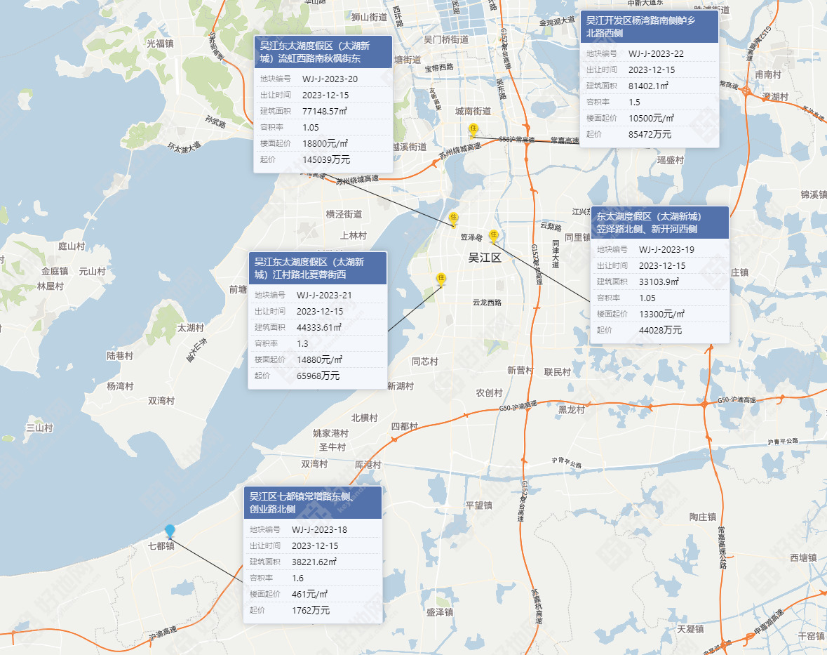 5宗地块全部位于吴江区,包括七都镇、太湖新城、老城区、开发区都有地块亮相。