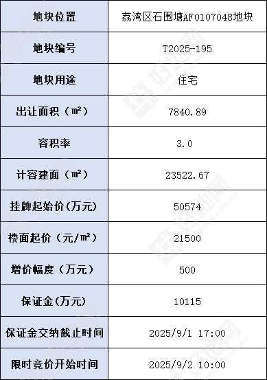 地块起价50574万元,楼面起价21500元/㎡,保证金10115万元,到账截止时间9月1日17时。