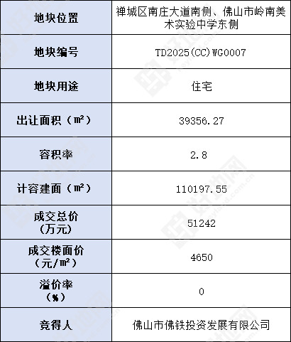 好地网8月4日消息(研究员 黄卓贤)今天,佛山出让1宗宅地,位于禅城区南庄镇,最终由佛山市佛铁投资发展有限公司以底价51242万元竞得,成交楼面价4650元/㎡,实际楼面价4834元/㎡。