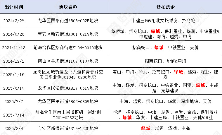 去年至今深圳所有溢价成交涉宅地参拍房企清单