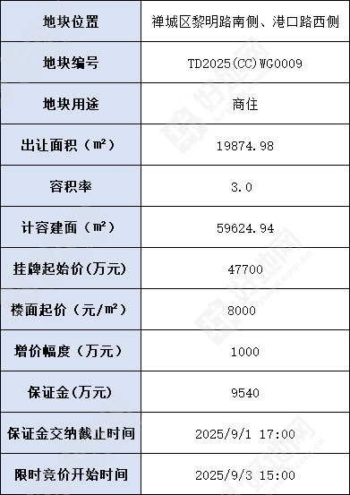 地块起价47700万元,楼面起价8000元/㎡,保证金9540万元,到账截止时间9月1日17时。