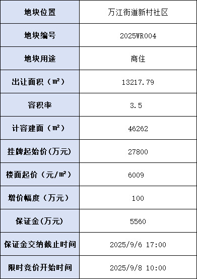 地块用地面积13217.79㎡,容积率3.5,建筑面积46262㎡,起价27800万元,楼面起价6009元/㎡。