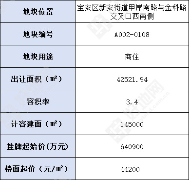 好地网8月14日讯(研究员 黄卓贤)8月15日,深圳将出让1宗商住地,位于宝安中心区,土地面积42521.94㎡,容积率3.4,建筑面积145000㎡,起价640900万元,楼面起价44200元/㎡。