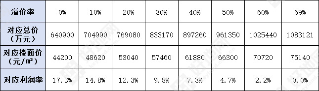 住宅按11万/㎡测算下,不同溢价率对应利润率测算