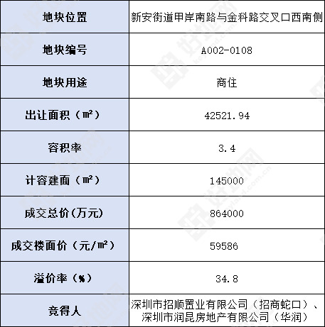 经过187轮线下竞价,地块最终由深圳市招顺置业有限公司(招商蛇口)、深圳市润昆房地产有限公司(华润)以864000万元竞得,溢价34.8%,成交楼面价59586元/㎡。