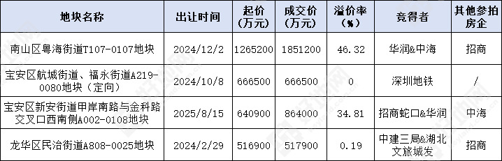2024年至今深圳起价超50亿元涉宅地成交情况