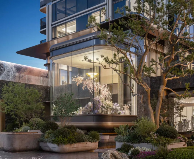 当下沉庭院景观成为标配后,形式上迎来了再创新,如杭序府,创造出了三层下沉庭院景观视觉效果,四根藤蔓“生机之树”撑起巨大的三层观景门廊,整体视觉感官比较震撼。