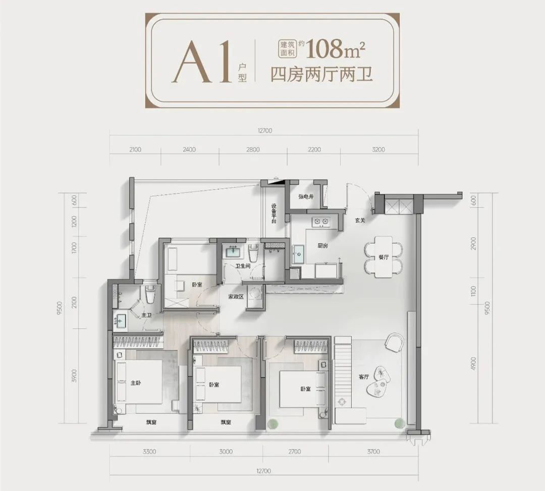 也有几种方法同时使用,让得房率增加,例如萧山君潮润府108㎡户型做到四房,飘窗、封闭阳台、设备平台三种方法让赠送空间有12.2㎡,得房率达到96%,性价比提升。