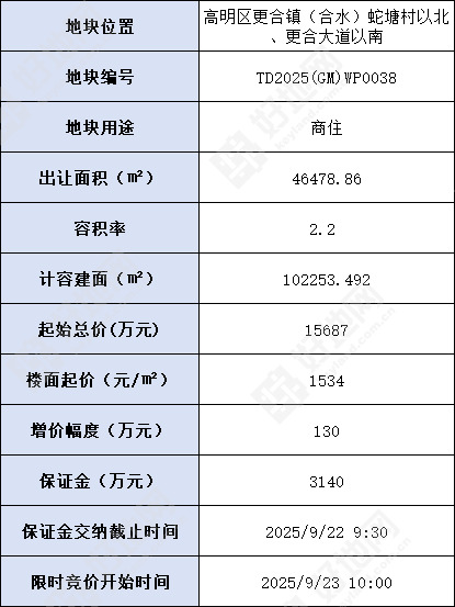 地块起价15687万元,楼面起价1534元/㎡,保证金3140万元,到账截止时间9月22日9时30分。