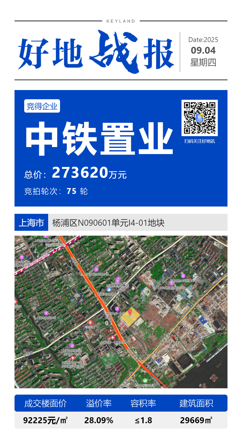 1、热度最高的杨浦滨江宅地吸引9家房企参拍,最终由中铁置业&如皋市交通产业集团以总价27.362亿元竞得,溢价28%,成交楼面价92225元/㎡。