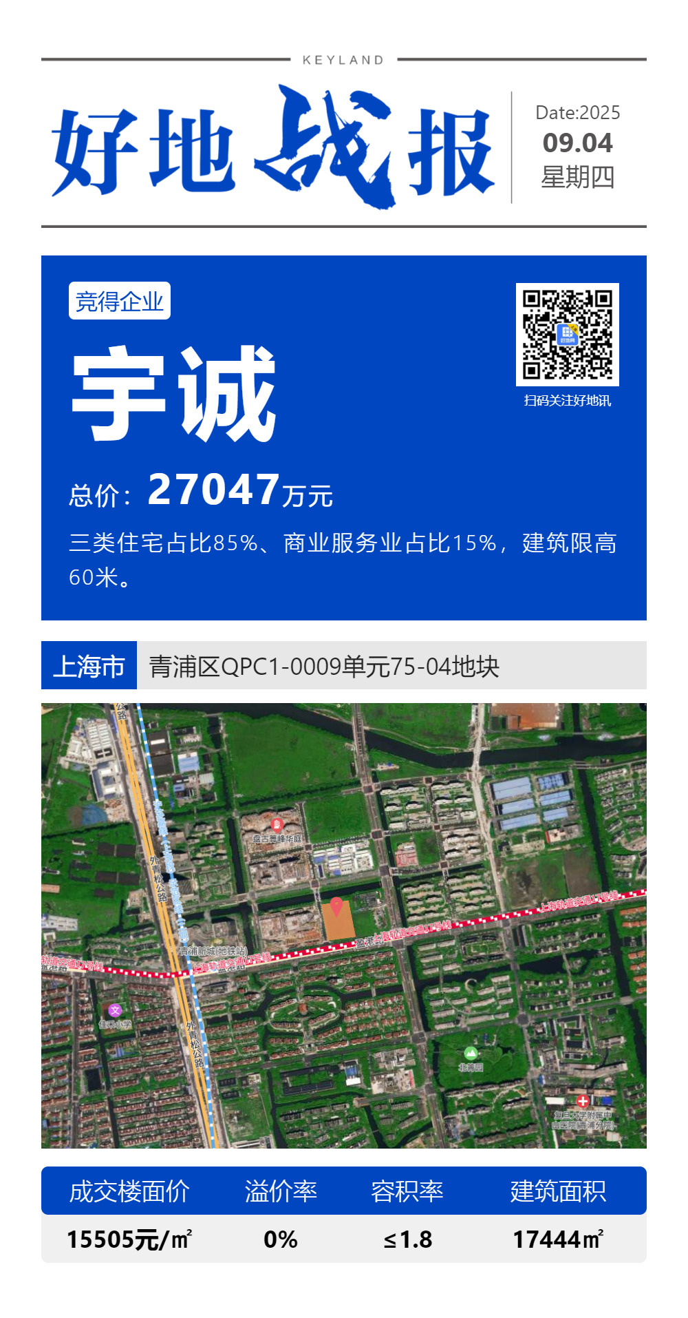 5、青浦新城迷你商住地由首入上海的宇诚集团股份有限公司底价竞得,总价2.7亿元,成交楼面价15505元/㎡。