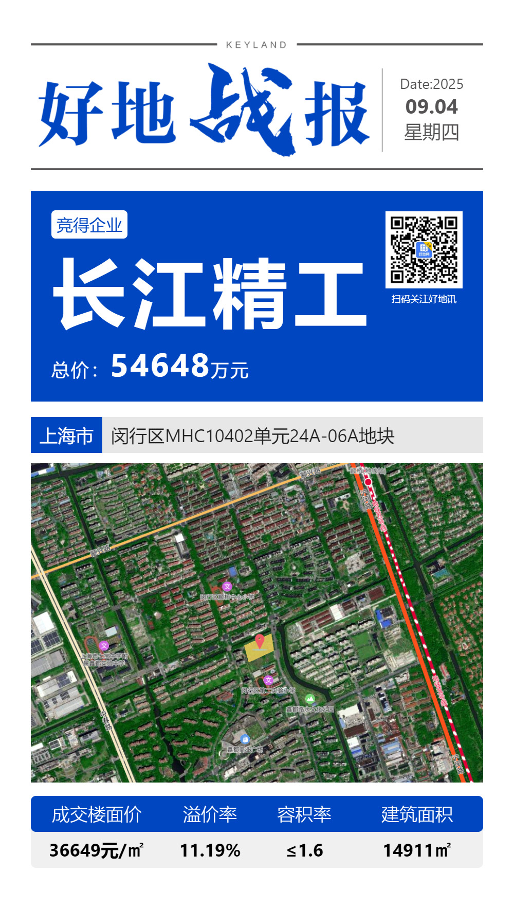 3、闵行颛桥宅地吸引3家房企参拍,最终由首入上海的浙江精工钢结构集团有限公司以总价5.5亿元竞得,成交楼面价36649元/㎡,溢价11.19%。