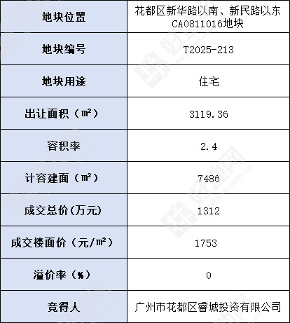 好地网9月17日讯(研究员 黄卓贤)今天,广州出让1宗宅地,位于花都区,为全自持保障性租赁住房,最终由广州市花都区睿城投资有限公司以底价1312万元竞得,成交楼面价1753元/㎡。