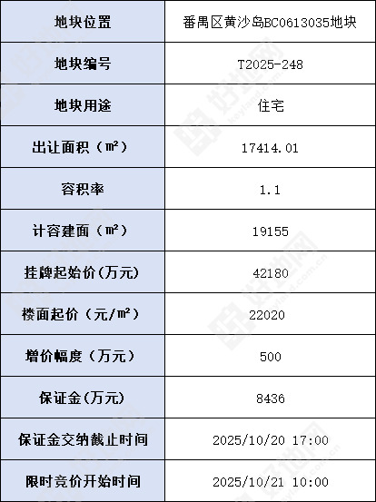 地块出让面积17414.01㎡,容积率1.1,建筑面积19155㎡,起价42180万元,楼面起价22020元/㎡,保证金8436万元,到账截止时间10月20日17时。