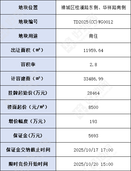 地块起价28464万元,起始楼面价8500元/㎡,保证金5693万元,到账截止时间10月17日17时。
