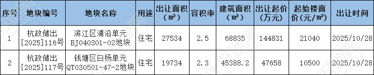 地块分别位于滨江区浦沿单元、和钱塘区东部湾新城,总出让面积70.9亩,总建筑面积11.4万方,总起价192489万元。其中: