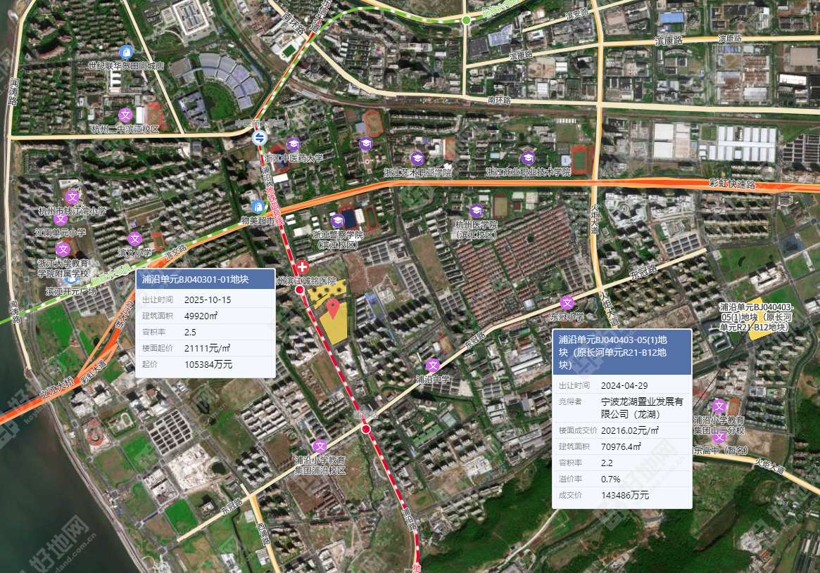 地块北侧一路之隔,浦沿单元BJ040301-01地块挂牌中,预计10月15日出让。地块容积率2.5,建筑面积4.99万方,起始楼面价21111元/㎡。