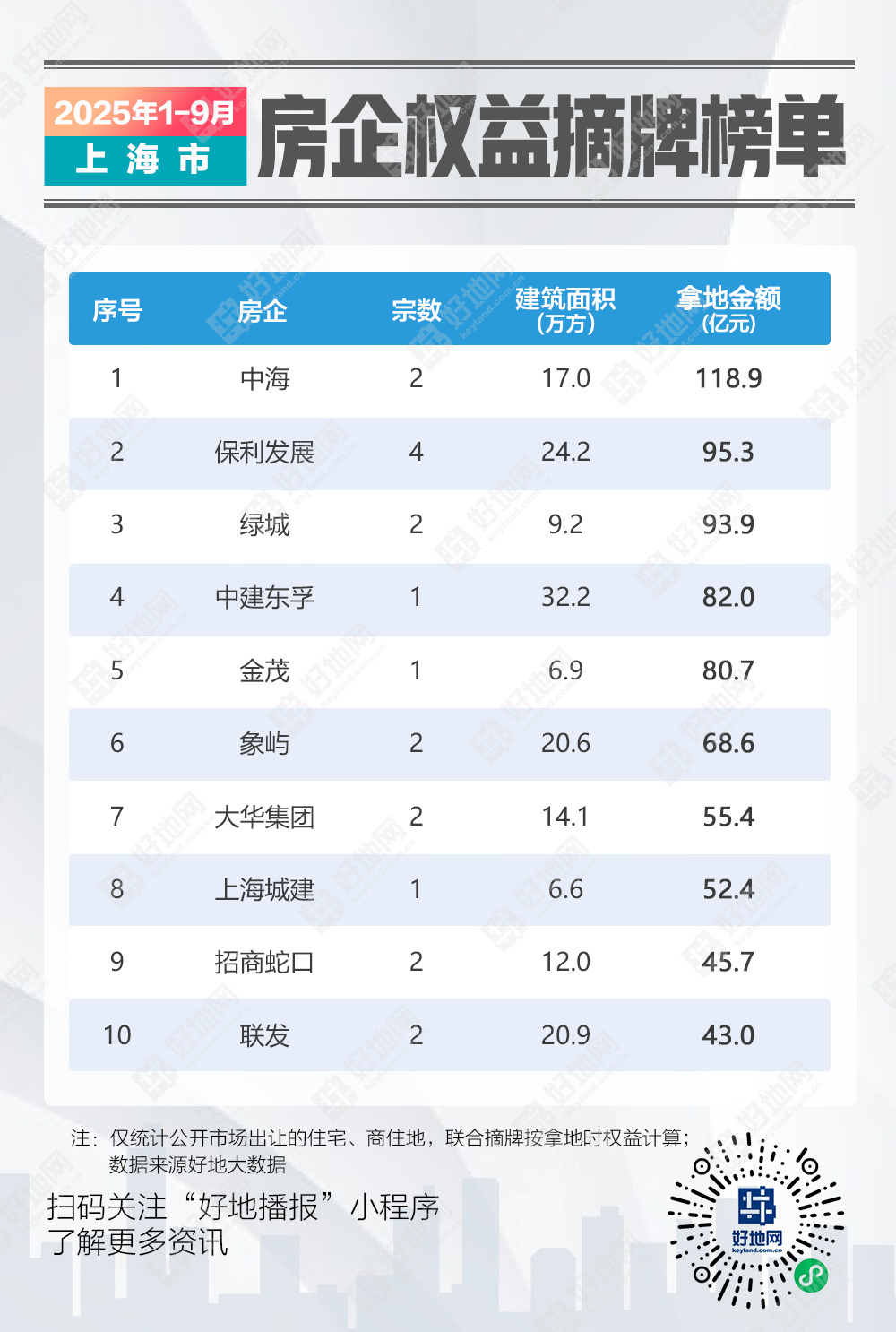 中海摘牌金额118.9亿元排首位,共竞得2宗地块,分别位于静安区和普陀区。