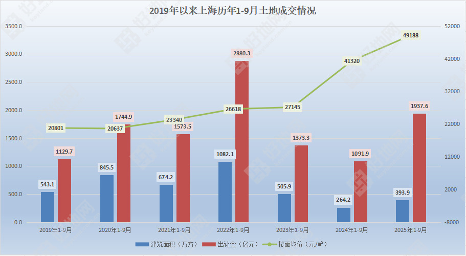 好地网9月30日消息(研究员 孙航海)据好地大数据,上海前三季度出让涉宅地(含协议出让)53宗,总出让金1937.6亿元,同比增幅77.5%;成交地块建筑面积和均价同样大增。