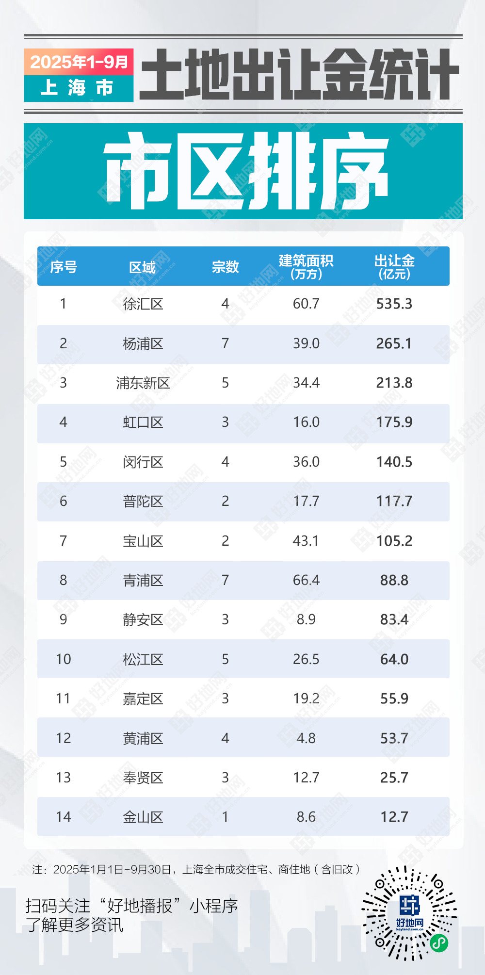 前三季度上海各区出让金情况多少?哪些房企在拿地?好地研究院统计如下: